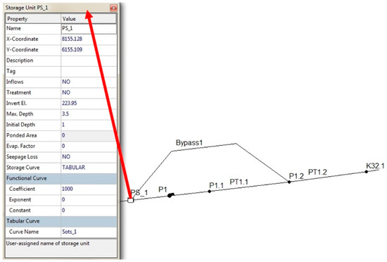 In the case of the pumping stations, the pump sump was simulated separately as a storage unit and the pump as a pump installed inline in a short conduit. In the pump curve editor in the field pump type, TYPE3 was selected and values of the pump heads and the corresponding flows in tabular form were introduced. Additionally, the emitter installed in the pumping station was simulated by conduit links PT1.1, PT1.2 and Bypass 1 (Figure 8). The pump sumps of pumping stations PS_1 and PS_2 were described by providing the elevation of the tank bottom and the initial wastewater level, equal to the shut-off level (Figure 8). In addition, due to the irregular shape of the tank in the storage curve field, the tabular values were given, and in the curve name field the name of the curve describing the change in the cross-sectional area of the tank in relation to the corresponding wastewater depth was given.