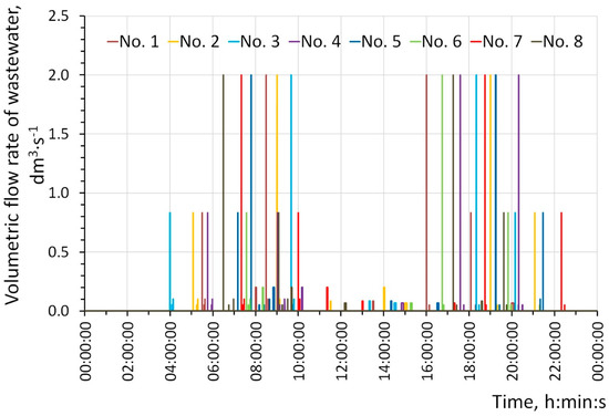An important issue was the simulation of the wastewater inflow to the SDGS system in the SWMM 5.1 program. The total number of served inhabitants was 172. In 86 buildings, there lived an average of two people per household. For this purpose, eight different patterns of wastewater inflow to the ST were created [11], which were replicated without any changes for nine days of simulation. When creating inflow patterns, the use of sanitary appliances in the time, quantity and volume of outflowing wastewater from the household was assumed according to Table 2. In the time series editor, the name (No. 1–8) of the inflow pattern was input and the values from relevant inflow histograms were pasted (Figure 9). The eight different patterns, shown in Figure 9, were assigned to STs at random. Each ST got one inflow pattern of the eight different patterns (No. 1–8).