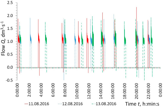 The measured values of the pump operation times along with the number of pump starts and daily wastewater flows for PS_2 and PS_1 are given in Table 3. The results of the measurement of wastewater flow, using an ultrasonic flow meter in PS_1, for three consecutive days are shown in Figure 10. When the pump starts, a significant increase in flow rate can be observed, which then decreases. This phenomenon results from an earlier partial emptying of the force main by the emitter in the pumping station. For this reason, the static and friction heads at the pump start-up were much lower than at the moment of pump shut-off. Moreover, the force-main PS_1-Sr1 with lateral connections were rarely fully filled due to their storage capacity (1.7 m3) being much higher than the active storage in PS_1 (1.05 m3). When the pump was shut off, a reverse flow occurred through the emitter back to the pumping station. In the initial phase, after the pump was shut off, it was the highest (around 0.26 dm3·s−1), and then it quickly decreased to about 0.01 dm3·s−1. It remained at this rate until the next pump start in the pumping station.