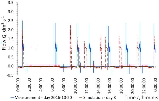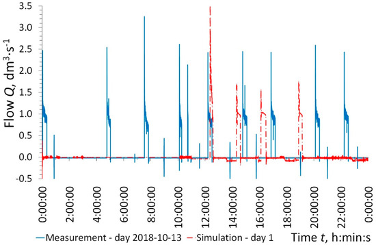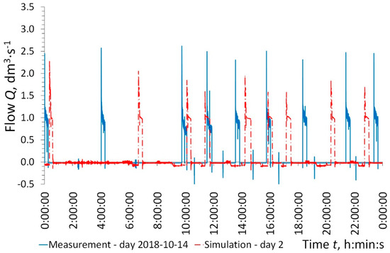 The results of the pump operation time and the number of pump starts per day in PS_1 and PS_2 obtained from the simulation are presented in Table 4. In addition, wastewater outflow from pumping stations PS_1 and PS_2 is given. Based on the results of the simulation for the first day, it can be concluded that there are very large discrepancies between the results obtained from the simulation and the results obtained from the measurements. However, it should be taken into account that the measurements were performed more than half a year after the network start-up period. The results from the simulations for the first day show in the early hours of the day no pump starts, which is related to the filling of pipelines in the initial phase of the simulation (Figure 11). After this period the work of the pumping station begins. Due to the lack of balancing of the inflow and outflow in the first days of simulation, there are still large discrepancies between the obtained results. On the next days of simulation the results are more convergent (Figure 12 and Figure 13). The simulation results obtained for the second and subsequent days turned out to be closer to the results obtained from the measurements. On the basis of the performed simulation it can be stated that there is a need for initiation of the simulation (equal to one day in this case) and only the results of subsequent days should be compared with measurements. In some places the pump start time converges with the results obtained from the measurements. Full convergence of the simulation results with the results from the measurements was not obtained, but it is hardly possible due to the lack of water use measurements. Flows in the SDGS system depends on the amount of wastewater flowing into the system as well as the time and place of its inflow. Such flows are characterized by high randomness. The results of field measurements indicate large variability on individual days of measurements in the amount of pumped wastewater (Qdav = 8.02 ± 0.38 m3·d−1), pump operation time (8811 ± 398 s), numbers (8.1 ± 0.4 d−1) and moments of pump starts. For this reason, it is possible only to a certain extent to imitate the flow in the SDGS system using the SWMM. In the case of semi-technical and laboratorial studies, good concordance of the simulation tools with measurements was obtained [22,41]. Omitting the first day of simulation, the values for the average pump operation time in PS_1 and in PS_2 were close to the mean value obtained from the field measurements. A similar convergence occurs in the number of pump starts and outflow from PS_1 (Table 4).