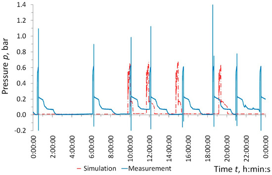 The used programmable logic controller was equipped with a function detecting pressure lasting for a long period of time (more than 24 h) inside the pipeline (14) (Figure 7). This enabled detection of abnormal network operating states, in particular, the emptying of drainage pipes taking tool long (together with the STs) or lack of wastewater inflow. This latter problem may be caused by blocked ST outflows or clogged drainage pipelines. However, most often pipeline clogging is caused by trapped air.