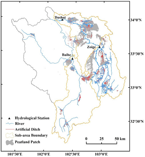 First we divided peatland patches in the study area into three subareas, each one of which was related to one of the gauging stations where daily water discharges were obtained (i.e., Dashui, Zoige, and Baihe) (Figure 2). Second, we calculated the total volume of water passing through each station in raining days within a given year. This volume (v) represented the total amount of storm flow from each subarea during the year. Third, we identified in each subarea five patches with variable sizes and numbers of ditches. Fourth, we determined the volume of water from each patch (vi) in each subarea by vi = v (Ai/As), where Ai is the area of each selected patch and As is the area of the associated subarea. Fifth, using the value of vi and the number of raining days, we calculated the mean water discharge (Qi) from each selected patch. The mean water depth, Di, in ditches within each selected patch was then determined using Equations (3) and (4). These five values of Di in each subarea reflected possible variations of mean water depth in all ditches within each subarea. Performing descriptive statistics would lead to three final representative water depths for all ditches within the patches of the same subarea: the mean of these five, Dm, the mean plus the standard deviation, Dh, and the mean minus one standard deviation, Dl. The variation of these three values roughly reflected the possible range of uncertainty in determining the D value.