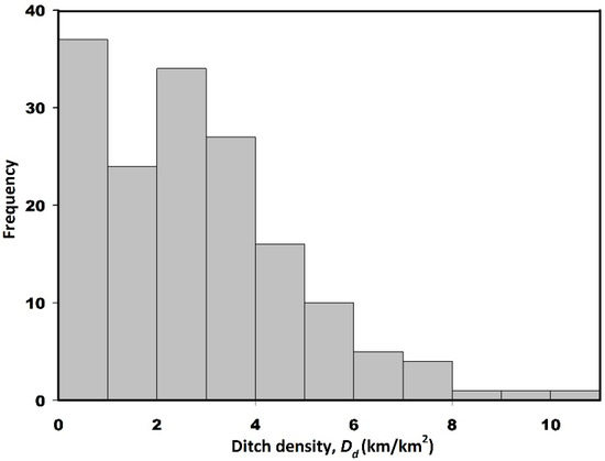 Histogram of ditch densities (Dd) in peatland patches; two modes existed in the 0 to 1 and 2 to 3 km/km2 ranges.