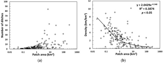 Structural characteristics of artificial ditches. (a) Ditch number in each patch vs. patch area; (b) ditch density within each patch vs. patch area.