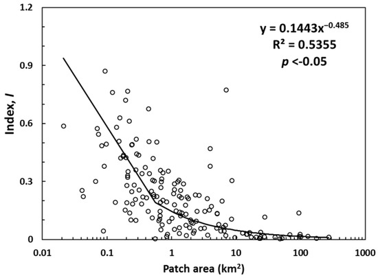 Unfortunately, this standard oversimplified the complexity of ditch densities in all patches. For example, two patches with significantly different areas (i.e., 0.55 and 27.89 km2) could have a similar Dd value (i.e., 3.08) (patches a and b in Figure 4), suggesting that the ditch density failed to fully capture the potential impact of the patch area on structural hydrological connectivity. The structural impact of areas on ditches may be demonstrated in two aspects. First, both the number of individual ditches and increasing trend of this number increased with the patch area (Figure 5a). Also, in patches with larger areas, the ditch number varied to a much higher degree. Second, ditch density tended to decrease with the increase of the ditch area (Figure 5b). Although the trend followed a power function with the statistical significance, distinct scatter extended over the full range of the data, which was also consistent with the relatively low R2 value. This suggested that Dd alone was insufficient to characterize the impact of patch areas on ditch structures within patches. Indeed, the decreasing rate of Dd was different for patches with Dd greater and less than 2 km/km2 (Figure 5b), which was the threshold displayed in Figure 3. This consistency further demonstrated the limitation of Dd described previously. A possible missing component was the proportion of ditches that are directly connected to natural gullies and streams in each peatland patch (i.e., ditch drainage ability, Pa). The index, I, which incorporated the contributions of both factors to structural hydrological connectivity, showed an improved correlation with the patch area (Figure 6). This index displayed a relatively strong and statistically significant nonlinear relationship with the patch area. The relationship signified that I generally decreased with the patch area and the decrease rate was higher when A was less than 0.6 km2, while lower when A > 0.6 km2 (Figure 6). These results revealed that in small patches, the number of ditches was small, but structural hydrological connectivity was high, whereas large patches typically had more ditches with lower structural hydrological connectivity.