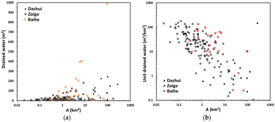 Patterns of drained ditch water in all peatland patches grouped into three zones (subareas) with regard to their areas in 1986. (a) Volume of the total drained water and (b) volume of the total drained water per unit area of each patch.