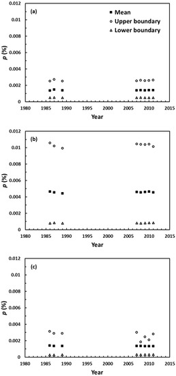 Temporal changes of p-values over the 1986 to 2012 period. (a) Dashui; (b) Zoige; and (c) Baihe. Data labeled upper boundary represent the possible high p-values in the same year, while data labeled lower boundary represent the possible low p-values in the same year.