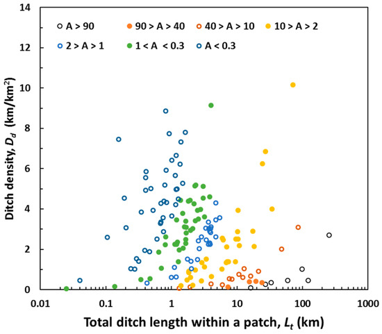 Relationships between ditch density (Dd) and total ditch length within a peatland patch for all patches (Lt) that were classified into seven groups based on patch areas (A).