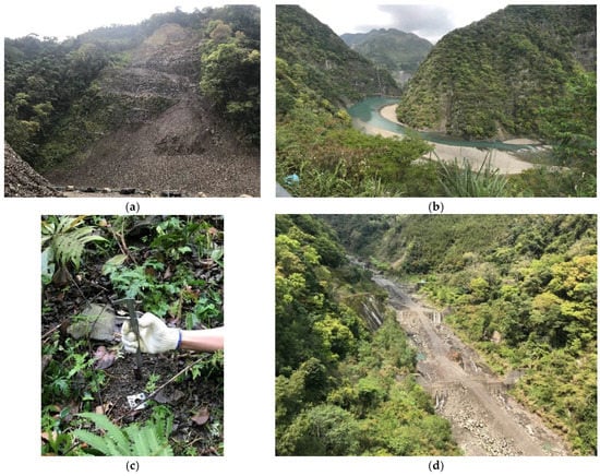 Site photos of the Shihmen reservoir watershed. (a) Example of a combination of soil erosion and shallow landslides. (b) Ronghua Dam, almost filled up with sediments. (c) Taking an erosion pin measurement near Bao-Li-Ku Creek. (d) A series of check dams filled up with sediments at Su-Le Creek.