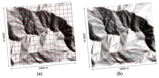 GIS (Geographic Information System) and soil erosion modeling usually go hand in hand, especially for large areas. As the study area is too vast to be covered in a single plot or unit, the Shihmen reservoir watershed is divided into many smaller units to facilitate computation and analysis. In GIS, the easiest way to accomplish the division of a study area is by using square grid cells, as shown in Figure 3a. Many spatial analysis tools in GIS support the use of gridded datasets. It is a superior method to a station-based approach, but could sometimes provide misleading information [30]. Still, many studies of soil erosion use grid cells in their analysis [9]. On the other hand, the grid cells do not conform to any natural land boundaries and the results may be biased. This is especially problematic for computing the slope-length factor L, which is the most difficult factor to calculate among the six factors of the USLE. To approximate the shape of the hillslopes and compute the slope length λ in Equation (2), different methods have been proposed, such as Hickey [31] and Sextante [32], the unit contributing area [33,34], and a combination of the unit contributing area and LS-TOOL [35]. In addition, Foster and Wischmeier [36] propose dividing a slope into segments.