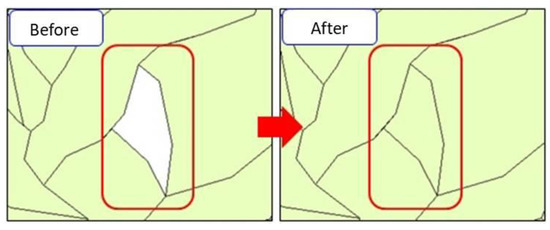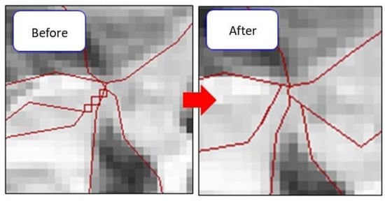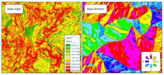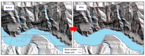 Although rarely used in soil erosion, the slope unit approach has often been applied to the study of landslides. The slope units were created by inverting the DEM to intersect with the original DEM. The intersections form the required slope units [37]. Unfortunately, the procedure is not fool-proof, and it requires manual inspection and editing. The editing includes the correction of slope angles and slope directions (Figure 4), removal of peculiar areas (Figure 5), filling in of missing areas (Figure 6), and disregarding shadowed areas and river surfaces (Figure 7). The use of slope units is also called the object-oriented approach [18,38].