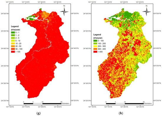 Soil erosion maps using (a,b) grid cells; (c,d) grid cells with a horizontal projection; (e,f) grid cells using SAGA (System for Automated Geoscientific Analyses); and (g,h) slope units.