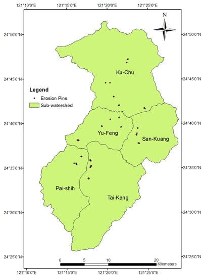 Locations of erosion pins in the Shihmen reservoir watershed.