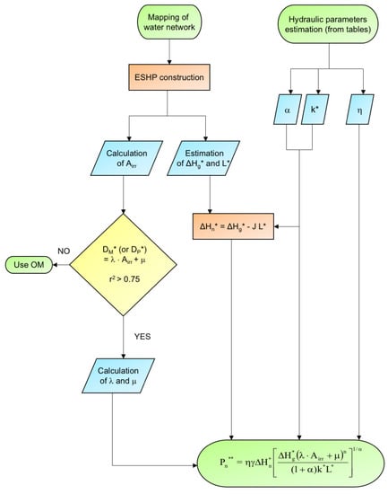 Finally, the hydraulic calculations of the water network, having gross hydraulic head (ΔHg), and pipeline diameter, and length (D and L), respectively, provides Pn of the SHP plant (whose efficiency is η) and the corresponding Q* (see list of abbreviations), as follows.