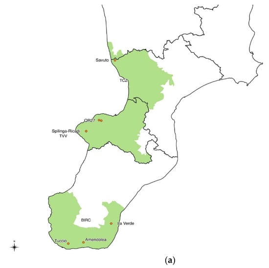 The SM and OM were applied in seven collective irrigation systems located in three WUAs of Calabria: “Spilinga-Ricadi”, “Murria” and “QR27” (WUA “Tirreno Vibonese”—TVV; “La Verde”, “Amendolea” and “Tuccio” (WUA “Basso Ionio Reggino”—BIRC; “Savuto” (WUA “Tirreno Catanzarese—TCZ) (Figure 2).