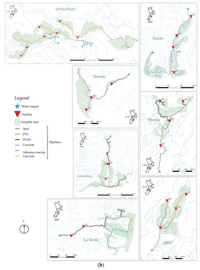 Based on output data of the water network analysis and hydraulic calculations, three (“Savuto” system) to seven (“Spilinga-Ricadi” and “La Verde” systems) turbines were sized and located. According to the smalls hydro association classification, ΔHg was low (18 m, “QR27” and “Savuto” systems) to high (196 m, “Tuccio” system). The pipeline length varied from 622 (“La Verde” system) to 4308 m (“Savuto”) (Table 2).