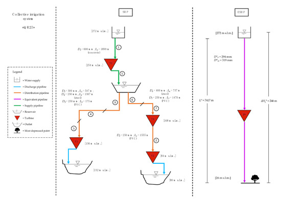 Subsequently, the SHP plants, planned by the OM, were schematized using the SM in as many ESHP systems, whose main hydraulic parameters are reported in Table 3. As it can be noticed, the SM replaced the SHP plants with equivalent water networks with higher ΔHg* (up to 246 m, “QR27” system) and L* (up to about 24 km, “Amendolea” system). Figure 3 reports the comparison between the SHP and the ESHP plants in the sample irrigation system “QR27”.