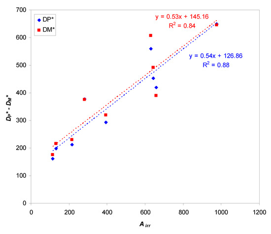 Plotting DP* or DM* against Airr of ESHP in each irrigation system (Figure 4), the following linear regression equations were obtained (the related coefficients of determination are reported in brackets):
