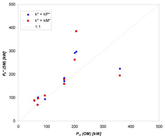 Comparison of the net electrical power (Pn) estimated by the original (OM) and simplified (SM) methods (Pn** for k* = kP and kM) for evaluating SHP energy production in seven irrigation systems of Calabria (Southern Italy).