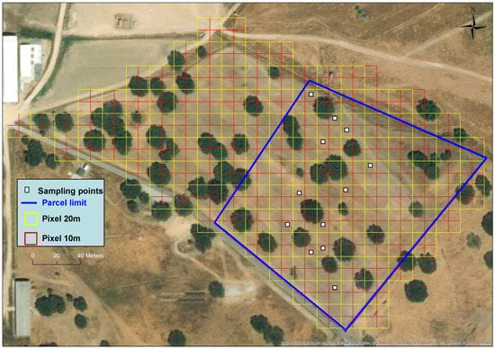 The annual vegetative cycle begins in autumn, with the appearance of the first rains, and then goes through a dormancy period in winter, due to the low temperatures. In the spring, the simultaneous combination of temperature and precipitation creates conditions for a period of great vegetative vigor. From autumn to spring, pasture is the main source of animal feed in extensive grazing systems; however, starting in late spring or early summer, low precipitation and high temperatures accelerate the final stages in the pasture vegetative cycle, clearly decreasing its nutritional value. In this critical period, farmers need essential data on the spatial and temporal variability of pasture biomass availability in order to safeguard a minimum supply of high quality feed throughout the year [] and evaluate possible feeding supplementation strategies for the animals, to cover at least their maintenance needs. This information can assist farmers in site-specific soil, pasture, and animal management in agro-silvo-pastoral systems []. Viable animal production under these conditions depends heavily on well-informed pasture management and feed planning [].
