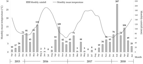 Thermo-pluviometric diagram of the Mitra meteorological station between September 2015 and June 2018.