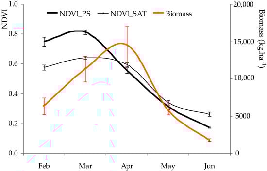 Evolution, between February and June 2017, of pasture productivity (Biomass) and vegetation index obtained by proximal sensor (NDVIPS) and by satellite (NDVISAT). Data are average values of the twelve sampling points.