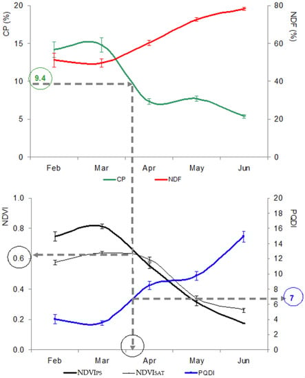 The ratio between NDF and CP was presented in [,] as an index (PQDI) that reflects the degradation of pasture quality: higher values of this index correspond to a higher fiber content and lower CP content in the pasture. Figure 4 shows the continuous increase of this index between March and June 2017, which is different from the pattern observed for NDVI. The arrows in this figure indicate the correspondence between animal maintenance requirements in terms of CP, PQDI (7 in this case), and NDVI (0.6 in this case, independently of the form of measurement, PS or RS). The evaluation of the behaviour of NDVI (and, consequently, of PQDI and CP) may be important in order to understand the critical moment at which animal feed supplementation should be introduced, which will continue until the first rains at the beginning of autumn [,].