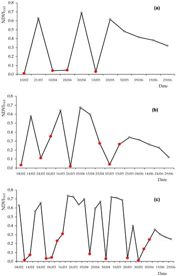 Figure 5 shows the reconstruction of historical NDVI trends, time series records of NDVISAT, retrieved between February and June of 2016, 2017, and 2018. Values are the mean of the 12 pixels considered in this study. Red circles identify, in each year, the images affected by cloud cover. In 2018, the shorter interval between successive satellite revisits (five-day temporal resolution) allowed a higher frequency of image capture than in 2016 and 2017 (usually 10 days), which is an important advantage when the cloud interference partially or totally affects the images [].