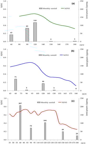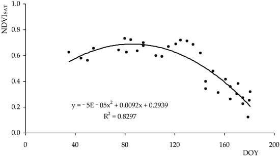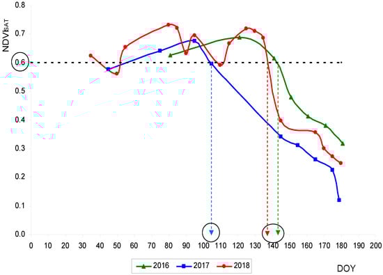 Figure 8 shows the trend line of NDVISAT observed between February and June over the three years (2016–2018). The use of NDVI time series was proposed in study [] to estimate the parameters describing vegetation phenology, a technique which is very relevant in multiple domains, such as productivity and the carbon cycle, climate change and its impacts on ecosystems, and crop and pasture monitoring.