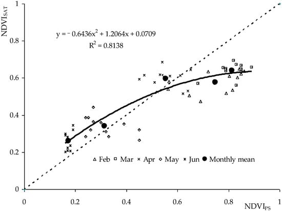 Figure 9 shows the correlation between NDVI values obtained by PS (NDVIPS) and those obtained by the satellite (NDVISAT), in the set of monthly sampling dates (between February and June 2017). The resulting significant and strong coefficient of determination (R2 = 0.8138, p < 0.01) shows the close relationship between these indexes. The smaller amplitude of variation of NDVISAT is also evident, as noted above. This “dilution effect” (NDVISAT > NDVIPS for values less than 0.5 and NDVISAT < NDVIPS for NDVI values greater than 0.5) would be expected as a result of the different scales of pasture sampling areas considered: while the sampling carried out with PS only covered three small areas (0.25 m2 each), RS sampling covered the area of a satellite pixel (100 m2) and can include the spatial details of the aboveground biomass across the entire area. “Scale effect” between RS and PS data was also reported by Zhao et al. [].