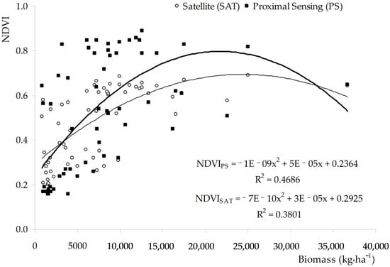 Figure 10, Figure 11, Figure 12 and Figure 13 show the correlations between NDVI (estimated from both PS and satellite images) and biomass, CP, NDF, and PQDI. All these correlations are significant, although stronger in the case of NDVIPS than in the case of NDVISAT, which immediately reflects the sampling process: while NDVIPS was obtained from PS measurements carried out directly on the pasture that was to be cut and subjected to analytical determinations (biomass, CP, NDF, and PQDI), NDVISAT involved a considerably larger sampling area, a factor particularly important due to the strong spatial and temporal heterogeneity characteristics of biodiverse pastures []. According to these authors, this factor contributes to non-linear relationships between NDVI and pasture parameters. Other key problem related to NDVI images may be due to noise or errors, which can contribute to non-linear relationships between NDVI and pasture parameters [,]. Although this article focuses on the monitoring of pasture quality indicators, the correlation of NDVI (obtained from PS and satellite) with pasture productivity is presented in Figure 10.