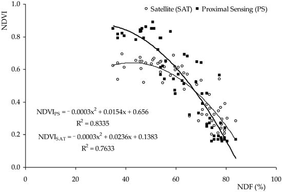 Correlations of NDVI obtained from PS or RS with pasture quality parameters (CP and NDF, Figure 11 and Figure 12, respectively) were relatively strong and significant: with CP, R2 = 0.7537, p < 0.01 for NDVIPS and R2 = 0.503, p < 0.05 for NDVISAT; with NDF, R2 = 0.8335, p < 0.01 for NDVIPS and R2 = 0.7633, p < 0.01 for NDVISAT. These values are within the order of magnitude of those obtained by Serrano et al. [] with PS (0.69 and 0.78, respectively, for CP and NDF) and of those obtained by Zhao et al. [] (0.61 and 0.58, respectively, for CP and NDF) with reflectance data obtained by RS. Pullanagari et al. [] and Albayrak [] also found satisfactory relationships between spectral measurements and pasture quality parameters, which can be attributed to the absorbance of visible radiance by the existing chlorophyll in green vegetation.
