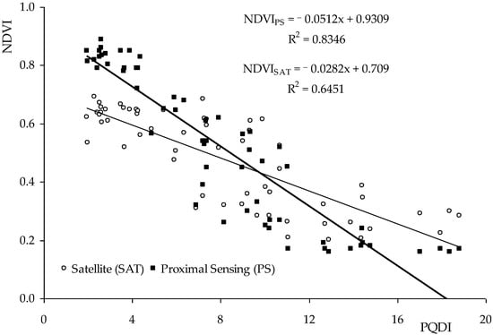 Correlation between NDVI values (obtained by proximal sensor, NDVIPS; and by satellite, NDVISAT) and pasture quality degradation index (PQDI), in the set of monthly sampling dates (between February and June 2017).
