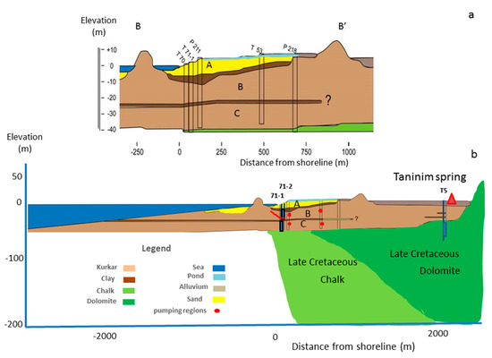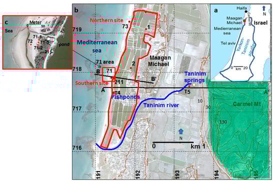 The thickness of the coastal Quaternary aquifer in the study area is 40 m (Figure 3a). It includes three sub-aquifers (Figure 3a). The shallow sub-aquifer is a phreatic Holocene sandy unit (unit A) with a thickness of several meters, which is separated from the underlying Pleistocene calcareous sandstone (locally called Kurkar) aquifer by a clay unit. The Pleistocene Kurkar is subdivided by another clay layer at an approximate depth of 20 m into two confined units, B and C, which in turn are underlain by the Late Cretaceous chalks. The coastal area is characterized by two N–S oriented Kurkar ridges on its western side, with the western one often partly or completely submerged [41,42]. In the study area, fish ponds occupy the area between the eastern ridge and the sea (Figure 1 and Figure 3a), with an annual infiltration to the aquifer of about 9 × 106 m3year−1 [40].