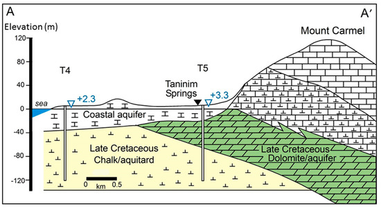 Hydrogeological section in the research area (A–A’ in Figure 1), modified after [35]. The coastal aquifer overlays Late Cretaceous limestone and dolomite aquifer in the east and chalk aquitard in the west. The dolomite aquifer (green) is the main source to the Taninim springs. The upper units in the Mount Carmel area, consisting of limestone and chalky limestone, are also of Late Cretaceous age. The blue number indicates the pre-utilization heads.