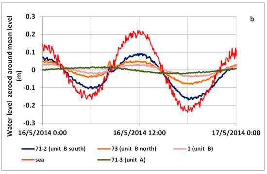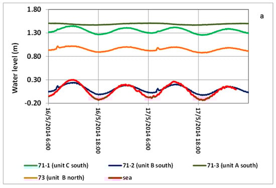 Figure 4a presents sea level and groundwater levels at the southern (wells 71-1, 71-2, 71-3) and the northern sites (well 73, Figure 1). Groundwater table in the intermediate confined unit (B) at the southern site was 0–0.3 m asl, while in the phreatic unit (A) and the deeper confined unit (C) it was higher, 1.5 and 1.3 m asl, respectively. The level in well 71-2 (unit B) and well 71-1 (unit C) was affected by a nearby pumping well, which is reflected in level increase during pumping breaks (i.e., return to more natural conditions) by 80 and 20 cm, respectively. At the northern site, water level in Unit B was higher (~1 m asl). In Figure 4b, we compare sea level and groundwater levels by zeroing to their mean values. Tidal fluctuation was hardly observed in the phreatic unit (southern site) at 70 m from the sea (1 cm), while it was clearly evident in the confined units B and C (amplitudes of up to 13 and 9 cm, respectively, during spring tide, compared with 21 cm at the sea, Table 1). At the northern site, maximum amplitude in unit B at 70 m from the sea and during the same period was just 7 cm. Level fluctuation decreased with distance from shore (4.5 and 3 cm at 300 m and 500 m, respectively, at the 2 and 1 sites, Table 1).