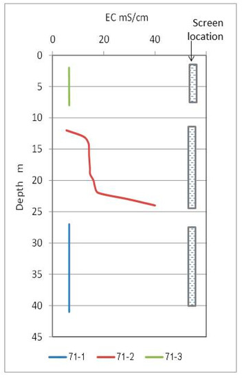 Electric conductivity (EC) profiles were conducted in the monitoring wells 71-1, 71-2, and 71-3 (locations in Figure 1) using a Robertson Geologging (RG) profiler.