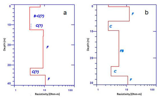 Representative TDEM (Time Domain Electro Magnetic) profiles at the northern site (a) and at the southern site (b). In the north, high resistivity is observed for both unit B and C (10 Ohm-m), while in the south the middle aquifer (unit B) has low resistivity (5 Ohm-m). The letters along the profile are the interpretation of the resistivity values: F—Fresh, B—Brackish, FB—fresh–brackish, C—Clay unit. Additional TDEM profiles are included in Figure S1 in the Supplementary Material.