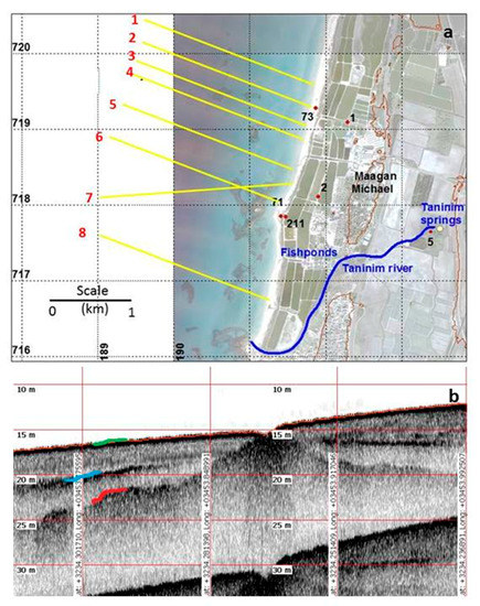 - Swarzenski, P.W.; Burnett, W.C.; Greenwood, W.J.; Herut, B.; Peterson, R.; Dimova, N.; Shalem, Y.; Yechieli, Y.; Weinstein, Y. Combined time-series resistivity and geochemical tracer techniques to examine submarine groundwater discharge at Dor Beach Israel. Geophys. Res. Lett. 2006, 33, L24405. [Google Scholar] [CrossRef]