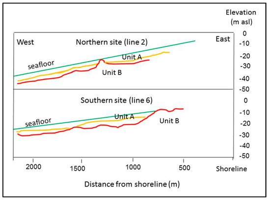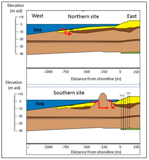 A CHIRP survey was conducted along eight parallel E–W offshore transects, 2 km each (Figure 7). The interpretations of the seismic data allowed the identification of the top of the upper clay and of the intermediate Kurkar unit (B). CHIRP results also show areas, where the clay layer is missing and the Kurkar rock is exposed at the seabed (e.g., Figure 7). The results of the survey suggest that there is a major difference between the southern and the northern sites with regards to the continuation of the upper clay layer (Figure 8). While at the southern site the clay was eroded around 100 m from shore line, at the northern site the clay layer is mostly continuous, and if missing, it occurs in limited areas relatively far from shore (>700 m). A sketch of the geological section, which expresses the difference between the southern and the northern site, is presented in Figure 9. The CHIRP survey also identified a “hot spots” (weak acoustic reflection in the high frequently CHIRP channel) along Section 2 and Section 3, which was interpreted as groundwater discharge at one of the unit B exposure sites (Figure S8 in the Supplementary Material).