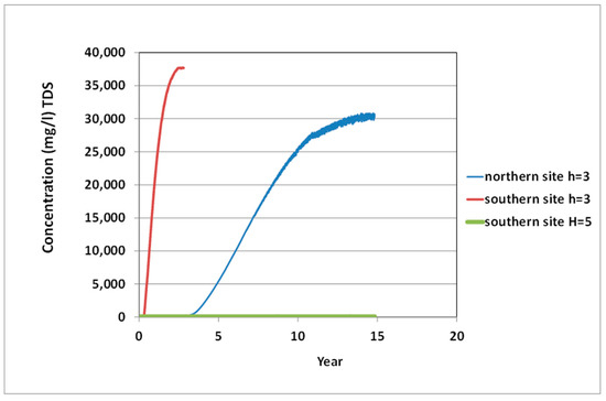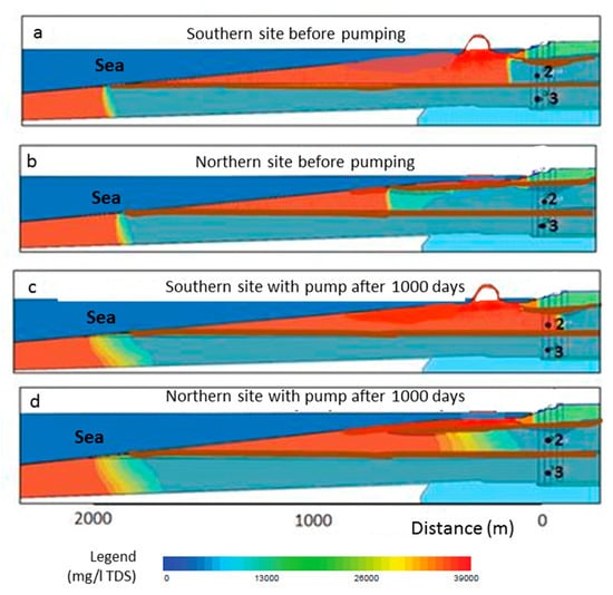 The fresh–saline water interface in unit B is located where the confining clay layers breach the seabed, which is further off-shore at the northern site than in the southern site (Figure 10a,b). The location of the interface does not change much after pumping in the case of an eastern boundary head of +5 m (not shown in Figure 10), while in the case of +3 m head, pumping results in significant inland shift of the interface in unit B (Figure 10c). The location of the interface after 1000 days of pumping is shown in Figure 10c,d, and the change in salinity in unit B at a distance of 70 m from the shore (in observation point 2, Figure 10) is shown in Figure 11. This shift occurs both at the southern and at the northern site, but while at the southern site the interface reached the pumping wells, no salinization occurred at the northern site during the first few years (Figure 11). At both sites, penetration of seawater in unit C was very limited.