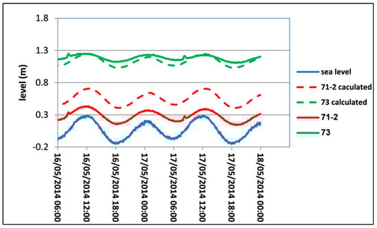 Measured and calculated water levels in observation wells in unit B, located 70 m from shore in the northern site (well 73) and in the southern site (well 71-2).