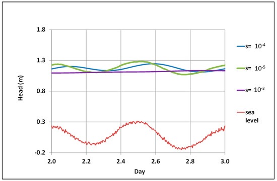 Transient heads at observation point 2 in the northern site (indicated in Figure 10, representing borehole 73) for various values of storativity/specific staorge of the confined unit B. Using high storativity, the aquifer tidal signal lags significantly after the sea, which is in disagreement with our observations.