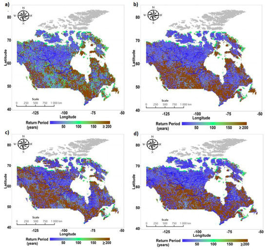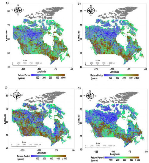 Future return periods of historical 100-year flood event for: (a) RCP 2.6; (b) RCP 4.5; (c) RCP 6.0; and (d) RCP 8.5. The results presented are GCM projections aggregated using the robust GCM median approach.