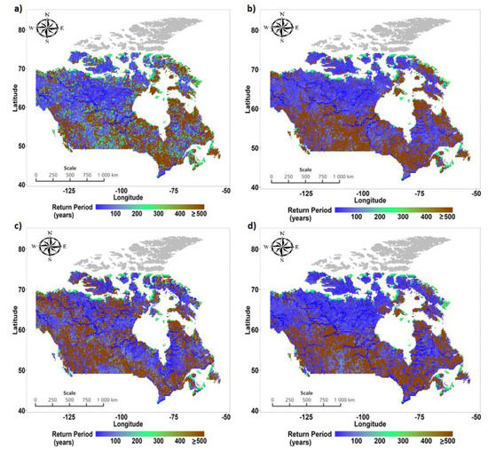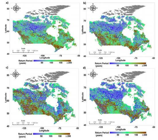 Results indicated that flooding frequencies of historical 100-year and 250-year return period flooding can be expected to increase considerably in the northern regions of Canada, with return periods of historical 100-year floods projected to reduce to 50-year floods or less in the future. This finding is in line with the findings from studies such as [28] which have analyzed observational flow records across Canada and have detected an increasing trend in extreme flows in the northern regions of Canada. A robust signal of projected decreases in flooding frequencies can also be noted from the results for the central and prairies regions of Canada, including areas of British Columbia, Alberta, Manitoba, and Saskatchewan, where the return period of historical 100-year floods can be expected to increase to 165–200 years in the future. These results are again in line with the observed decreases in peak flow trends in the prairies region [58] attributed largely to decreases in snowfall and increases in temperatures during the winter months. Finally, small parts of Nova Scotia, Newfoundland, and Labrador, and northernmost regions of Nunavut, and south-west British Columbia are also projected to experience no considerable changes in flooding frequencies in the future. A comparison of changes projected for 100-year and 250-year return period flooding events indicate that the spatial structure of projected changes is similar for flooding events of both magnitudes.