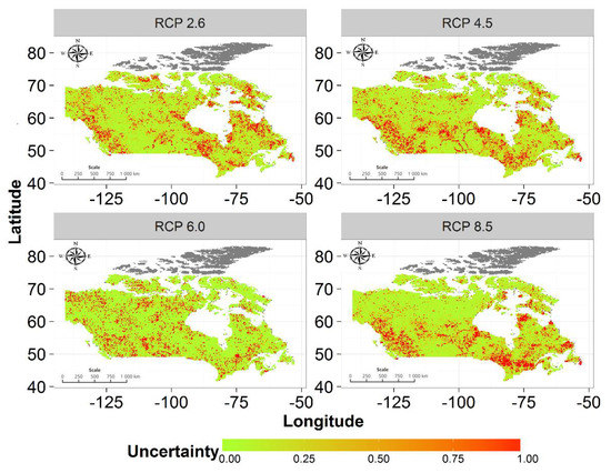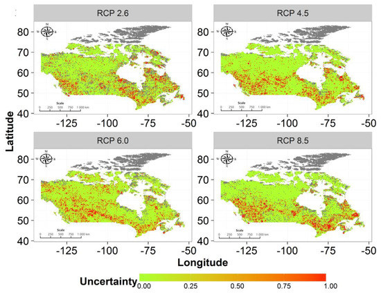 Uncertainty magnitudes obtained from future flood frequency projections of historical 100-year floods obtained in the cases of the robust GCM median approach and the GCM median approach are presented in Figure 5 and Figure 6, respectively. To present the spatial heterogeneity of uncertainty effectively, normalized values of uncertainty magnitudes are presented in the figures. The spatial distribution of uncertainty from both approaches was found to be similar; however, the uncertainty magnitudes obtained from all GCM median approaches were found to be higher than that obtained from the robust GCM median approach. Overall, increases in flood magnitudes projected in the northern provinces of Yukon, Northwest Territories, and Nunavut, northern Quebec, and south-west Ontario were found to be among the least uncertain results obtained. The decreases in flood frequency projected for the prairies region, northern Ontario, British Columbia, and Newfoundland and Labrador were found to be among the most uncertain results. These results indicated that there was a larger degree of confidence in the projected increases in flooding frequencies in parts of Canada than the projected decreases. Finally, between the four RCPs, the least uncertainty was found to be associated with the projected changes made under RCP 4.5 as compared to the other RCPs.