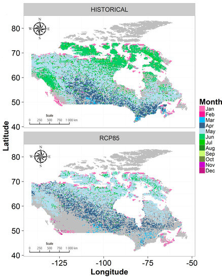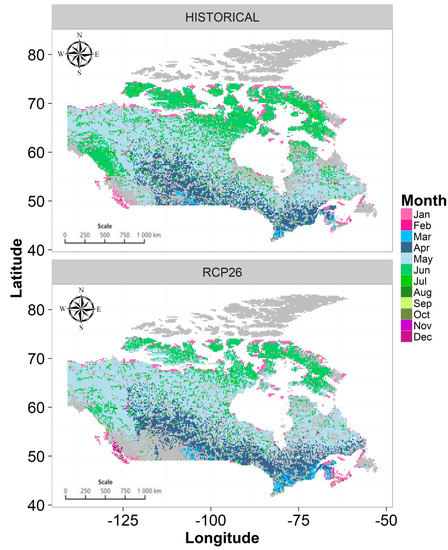 Spatial distributions of flood timing obtained for historical and future timelines are presented in Figure 7 and Figure 8 for two extreme RCPs with regard to greenhouse gas emissions: RCP 2.6 and RCP 8.5, respectively. In the figures, months where wintertime precipitation is likely to contribute to peaks, i.e., November, December, January, February, are shown in the shades of pink, months where snow-melt can be a dominant factor, i.e., March, April, May, are shown in the shades of blue, while months where summertime convection can be a dominant contributor to peaks, i.e., June, July, August, September, October, are shown in shades of green. Grids with non-robust flood timing results are shown in a grey color. Results clearly highlighted projected future increases in the total area effected by snowmelt driven floods (shown in the shades of blue), as well as an earlier onset of snowmelt driven floods in the future. These changes were most evident in the northern and central regions of Canada. Regions in Ontario and Quebec were projected with earlier summertime extreme flows (shifts from April/May to March). Most of the regions from Nunavut and Yukon Territories were projected to have earlier summertime extreme flow changes (from May to April). An earlier onset of snowmelt driven floods in the future was also evident from Figure 9, where grids that are projected with up to two months of early spring melt are shown. These results are in line with the findings from observational studies performed in different locations across Canada, where an earlier onset of snowmelt driven floods has been documented [59,60,61,62], as well as projected under the influences of climate change [34,63,64,65]. This observation is obtained consistently across all four emission scenarios considered for assessment, although it is noted that the GCMs were more uncertain on the prediction of the peak flow month in the cases of RCP 4.5 and RCP 8.5, than in the cases of RCP 2.6 and RCP 6.0.