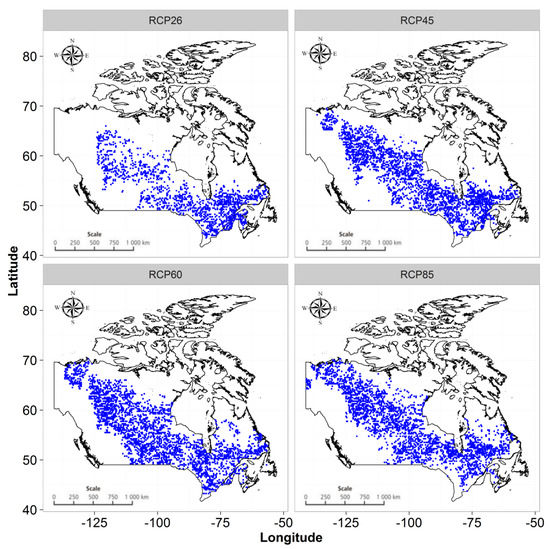 An assessment of projected changes in future flood timing indicates earlier snowmelt in almost all regions of Canada. This is expected, given that future temperatures are projected to increase across Canada under the influence of climate change [23]. Signs of increases in snowmelt-driven floods, and earlier snowmelt have been detected in historical flow records [66,67], as well as have been projected for many Canadian rivers [34,63,64,65]. The results obtained are thus also in line with the findings made in many previous studies performed at catchment scales in Canada.