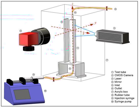 The experimental setup in the present work was based on the design of an experimental setup by Vladimirov et al. [], and some modifications were made according to the swimming speed of H. akashiwo. The experimental system mainly consisted of a test tube, an acrylic box, an imaging system, an injection system, and a planar laser with wavelength of 447 nm (MDL-F-447NM-3.5 W-1601, Changchun New Industries Optoelectronics Technology, Changchun, China), as shown in Figure 1. The test tube (15 mm × 15 mm × 190 mm) was modified based on that used by Vladimirov et al. [], which was located in an acrylic box (200 mm × 200 mm × 300 mm) full of water to maintain a thermostatic environment. Two thin rubber tubes that threaded through the sides of acrylic box were respectively connected with the inlet and outlet of the test tube. The 1.5 mm-thick laser sheet was used to illuminate cells in the centerplane of the test tube, which was controlled by a synchronizer to ensure that the cells were only illuminated during the exposure time. The imaging acquisition system consisted of a 16-bit CMOS (Complementary Mental Oxide Semiconductor) camera (PCO.edge 5.5, Intelligent Laser Applications of Germany, Aachen, Germany) with a resolution of 2048 × 2048 pixels, a lens (EF-S 60 mm f/2.8 USM, Canon, Tokyo, Japan), a 550 nm high-pass filter (Beijing JJAM Technology Limited corporation, Beijing, China), and an imaging analysis software (CamWare, Intelligent Laser Applications of Germany, Aachen, Germany). The injection system included a syringe pump (Pump 11 elite, Harvard Apparatus, Holliston, MA, USA) and injection syringes (Himilton, Reno, NV, USA) with various capacities, which was connected with the rubber tube to provide fluid for the test tube.