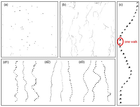 Images of motile cells: (a) algal cells (represented by dark spots) in one frame, (b) trajectories of cells in 30 frames, (c) one track/trajectory with dozens of walks, and three swimming patterns: (d1) helical trajectories, (d2) straight trajectories, and (d3) trajectories combined helical and straight ones.